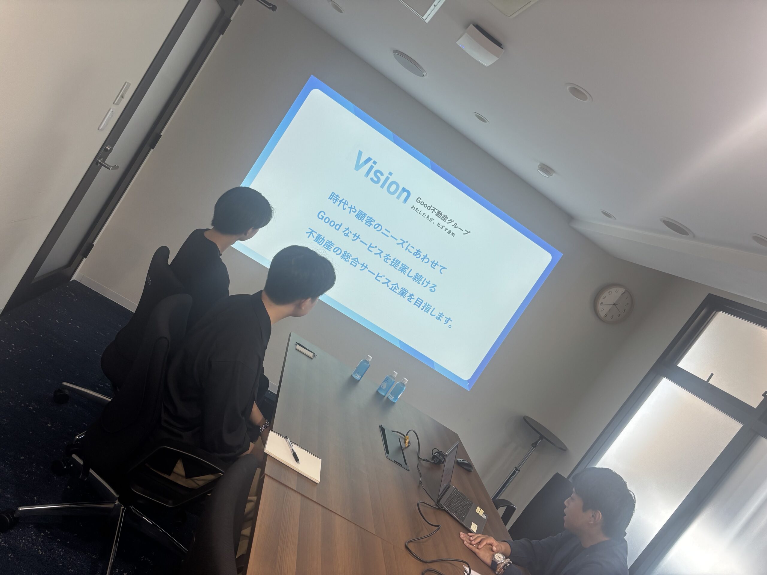 研修前半については、改めてGood不動産グループが掲げているVisionだったり経営理念・事業内容をお話し、研修後半は、次長方3名とのディスカッションの時間を設けさせていただきました!